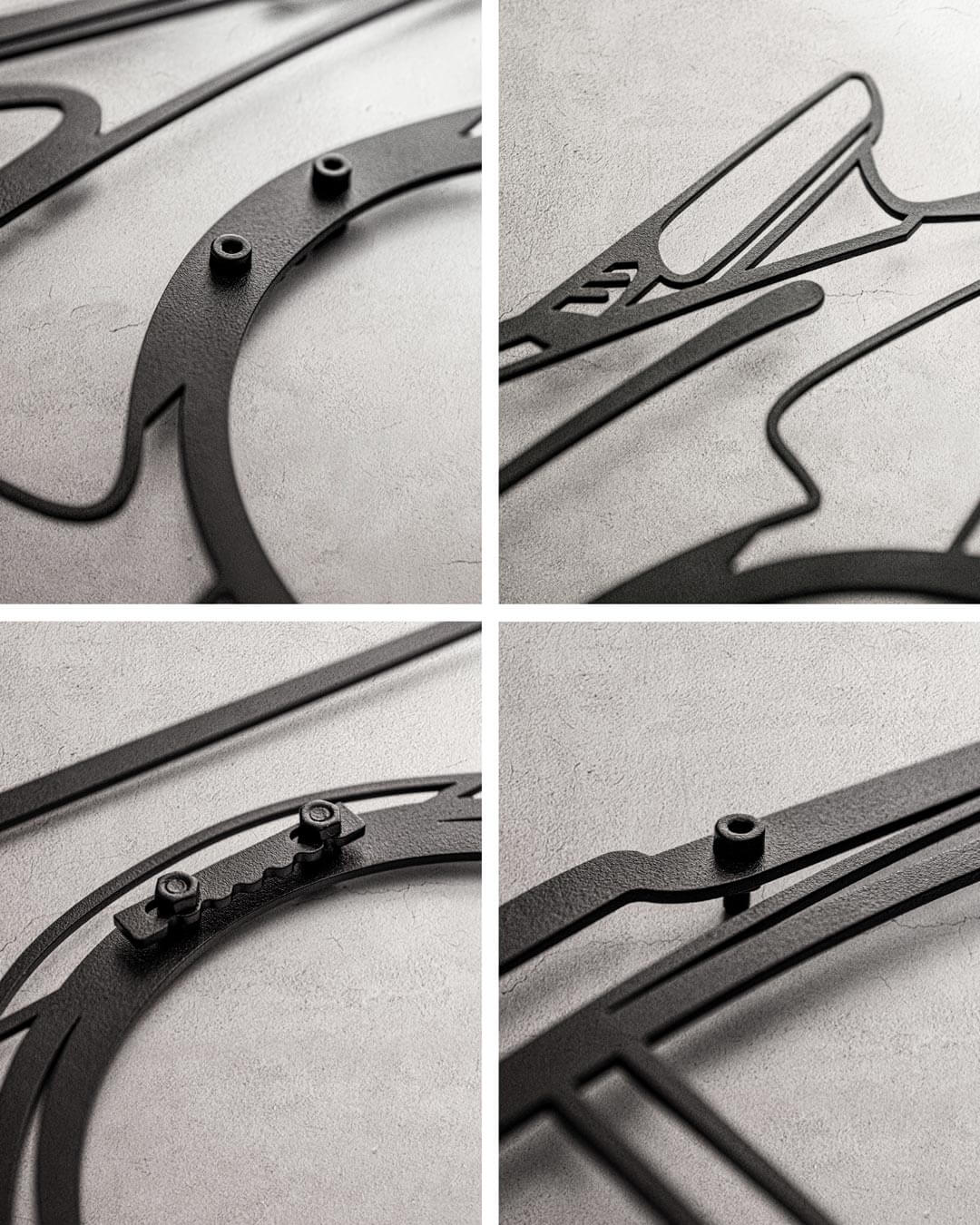 L’opera è ottenuta con taglio laser da una lastra selezionata di metallo 100% italiano, di 2 mm di spessore.